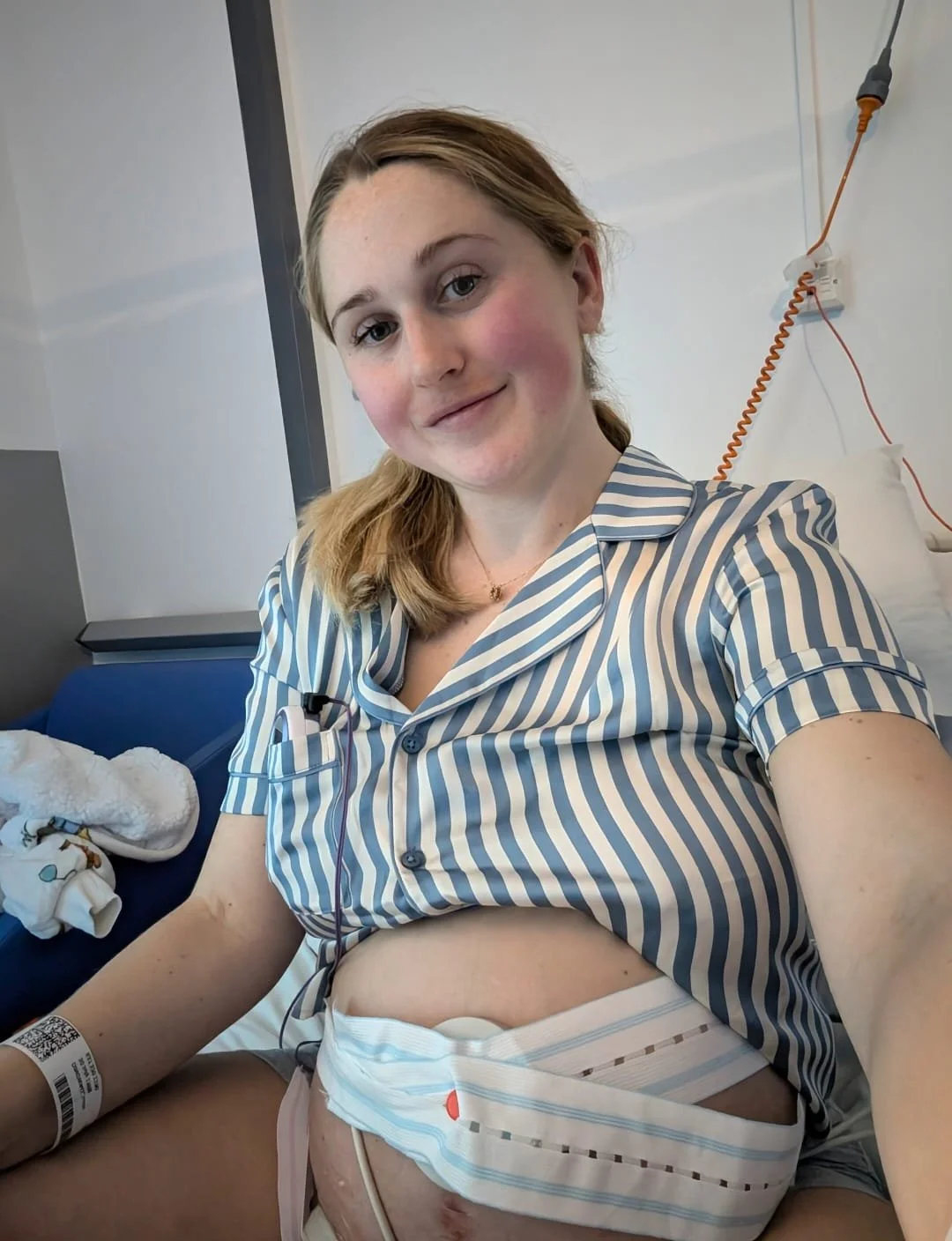“I went into early labour with regular 10 minute surges Tuesday morning. That evening they were every 4 minutes so I rang triage. Unfortunatley, there were no midwives on call that evening so I was asked to come into hospital instead of having a home birth. When I arrived, the midwife led unit was also closed so a water birth was no longer an option. I stayed in over night bit I wasn’t dilating (I think I was a bit upset about the pool which stopped my oxytocin).